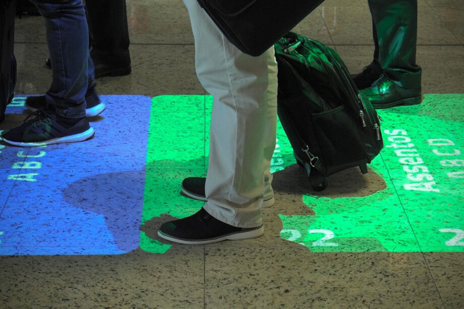 What's so good about it? As the above clip shows, airline boarding gates could be fitted with moving projections on the floor showing passengers how far away they need to be from each other (and how fast they need to move) in the boarding gate line.